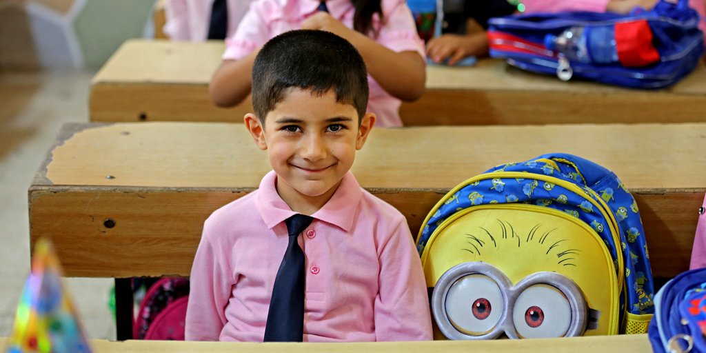 Displaced from Falluja, Laith, 6, is happy to start school in Baghdad.